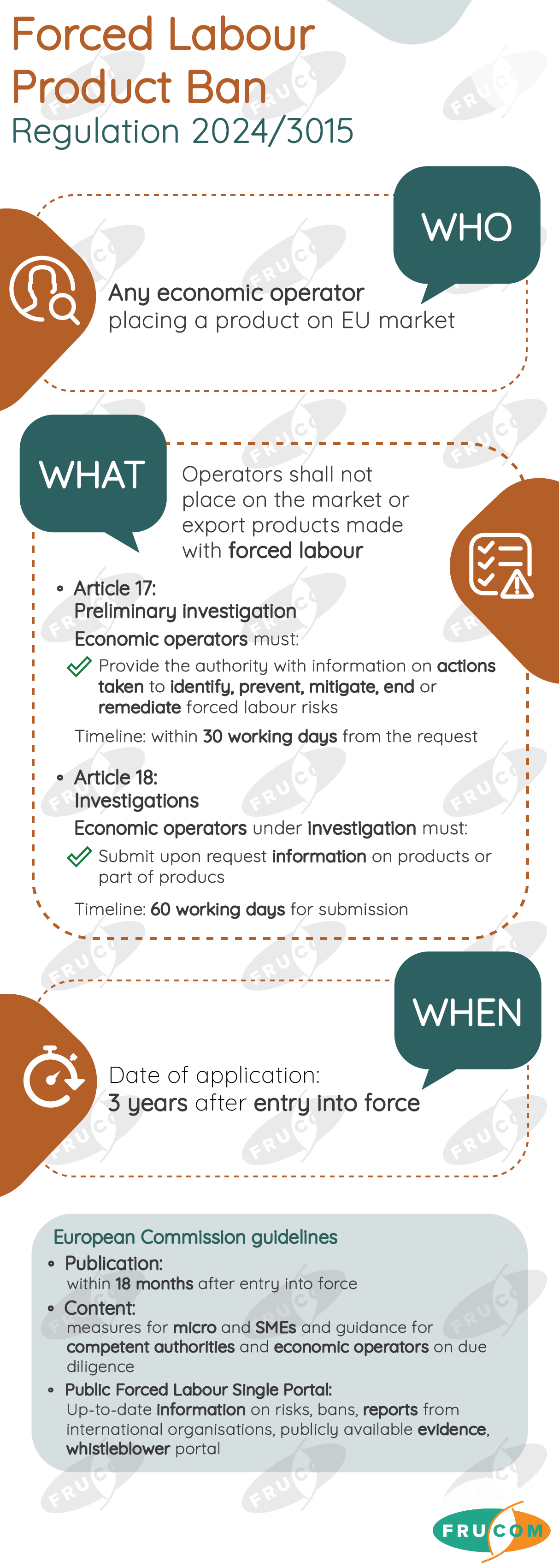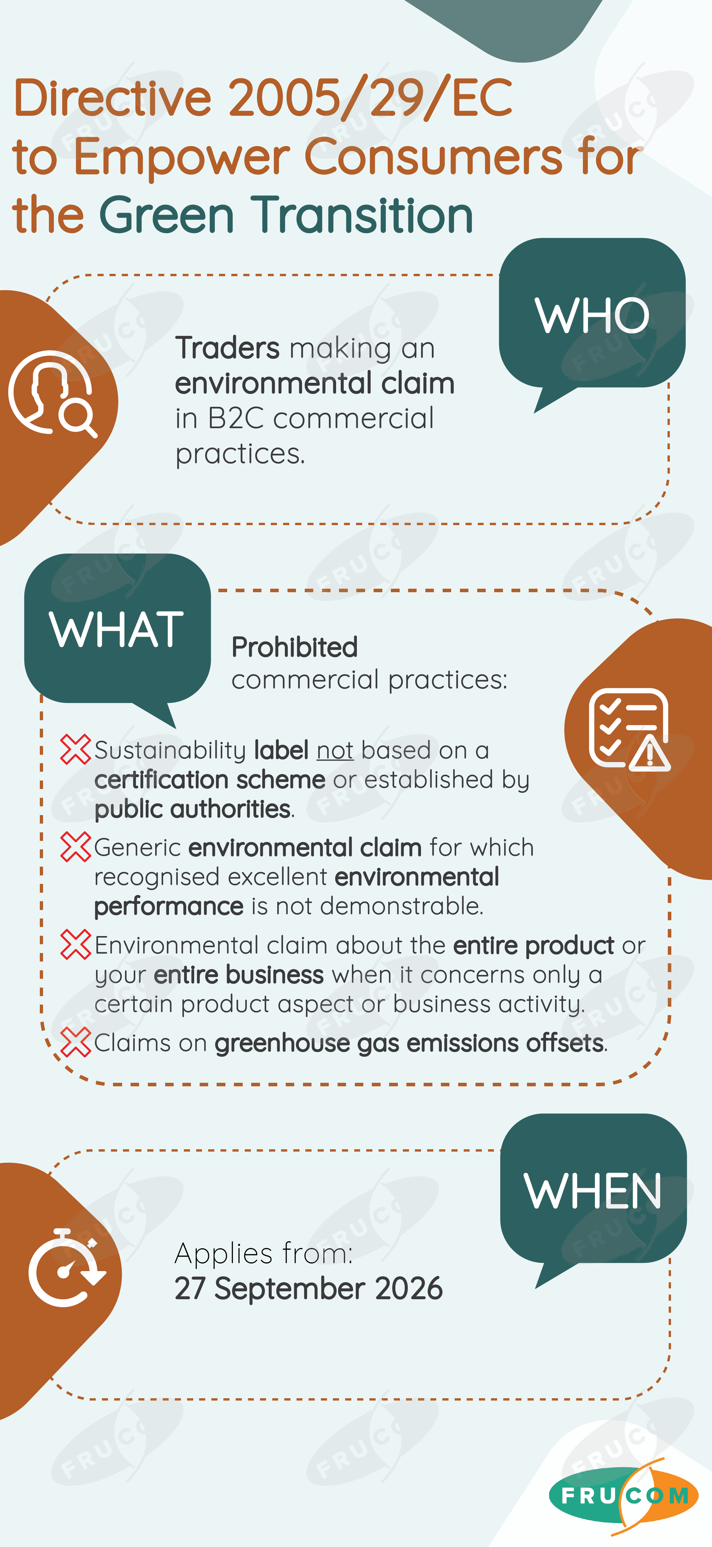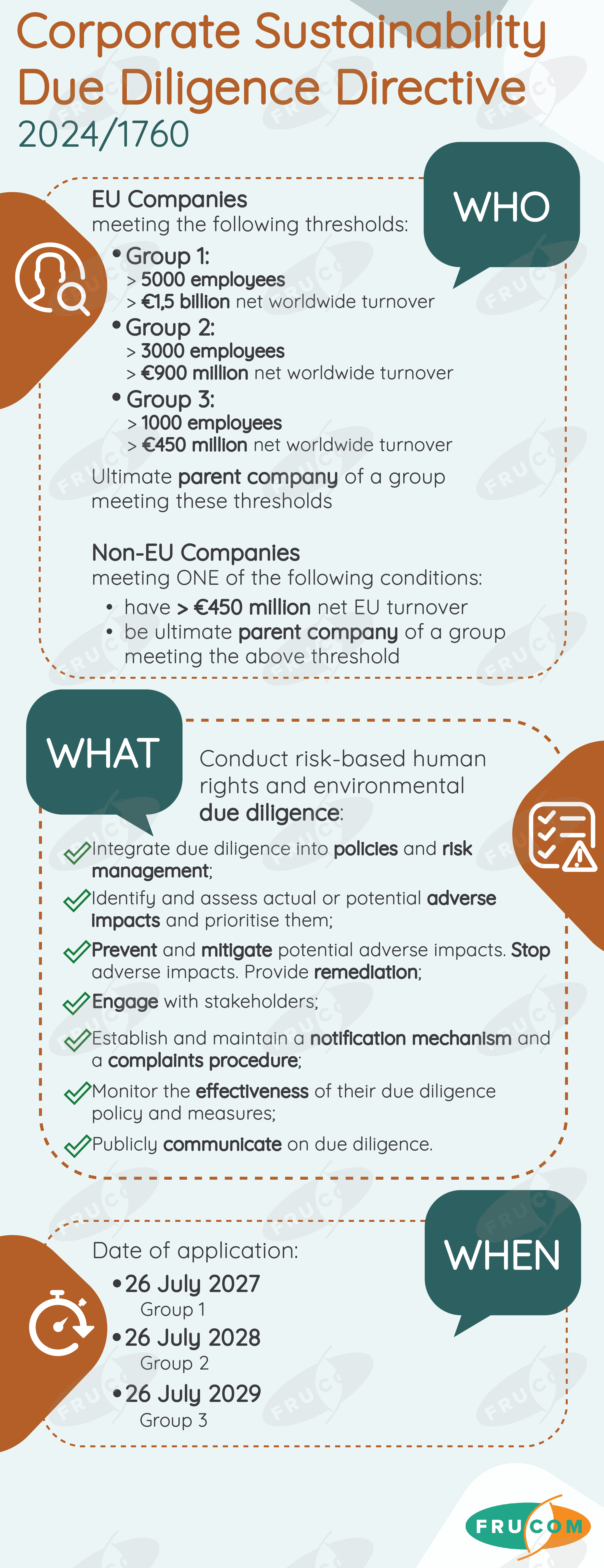 FRUCOM has developed simple visuals on EU sustainability legislation which focuses on who has to comply, what this compliance involves, and by when they will have to do so. The FRUCOM “At a Glance” visuals on EU sustainability legislation compliance can be downloaded below: